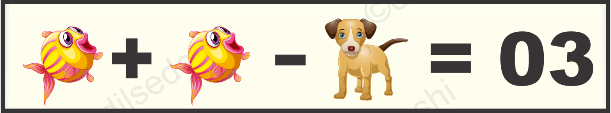 तीसरी पंक्ति में 2 मछली व एक कुत्ता है. एक कुत्ते का मान हमें पहले ही ज्ञात है वह है 5. चुकी मछली+मछली-कुत्ता= 03 है इसलिए मछली का मान 4 होगा,