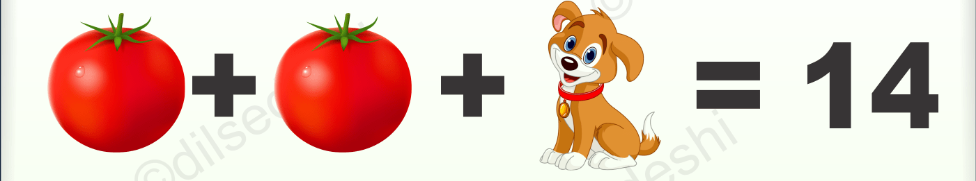 तीसरी पंक्ति में 1 कुत्ता और 2 टमाटर है चुकी हम एक कुत्ते का मान पहले ही निकाल चुके है वह 6 है तब हम आसानी से टमाटर का मान निकाल सकते है, यहाँ एक कुत्ते और टमाटर का सम 14 निकल रहा है, तब टमाटर का मान 4 निकलता है