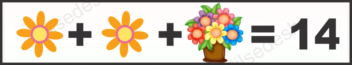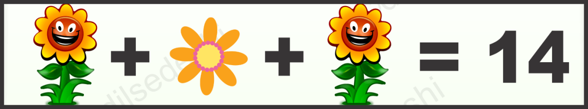 तीसरी पंक्ति एक फुल और 2 सूरजमुखी है चुकी हम एक फुल का मान पहले ही निकाल चुके है वह 4 है तब हम आसानी से सूरजमुखी का मान निकाल सकते है, यहाँ एक फुल और 2 सूरजमुखी का सम 14 निकल रहा है, तब एक सूरजमुखी का मान 5 निकलता है अतः 5 + 4 + 5 = 14