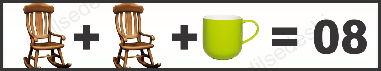दूसरी पंक्ति एक कप और 2 कुर्सी है. चुकी हम एक कप का मान पहले ही निकाल चुके है वह 2 है तब हम आसानी से कुर्सी का मान निकाल सकते है, यहाँ एक कप और 2 कुर्सी का सम 8 निकल रहा है, तब एक कुर्सी का मान 3 निकलता है अतः