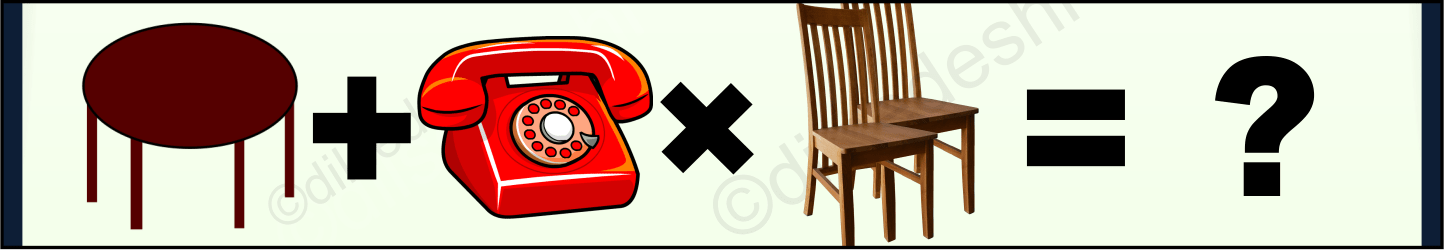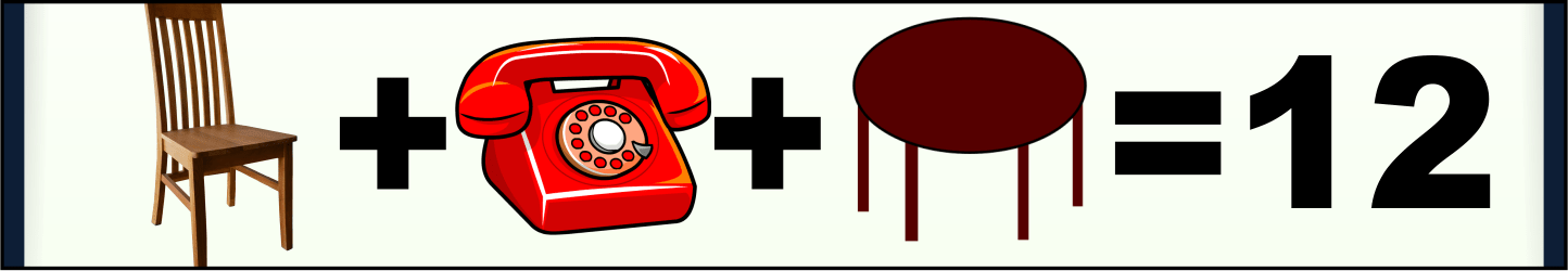 तीसरी पंक्ति में 1 टेलीफोन और 1 कुर्सी व 1 टेबल है, चुकी हम टेलीफोन और कुर्सी का मान निकाल चुके है वह 5 और 4 है. यहाँ कुर्सी, टेलीफोन व टेबल का सम 12 निकल रहा है, तब 4 + 5 + टेबल = 12