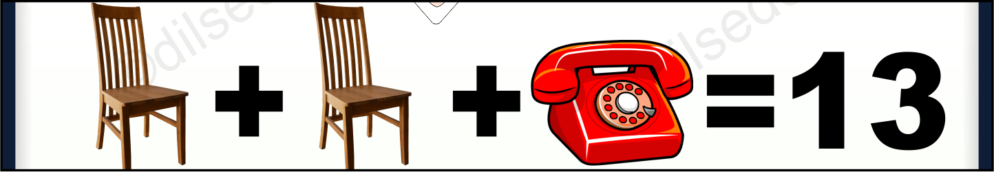 दूसरी पंक्ति में टेलीफोन और 2 कुर्सी है. चुकी हम टेलीफोन का मान पहले ही निकाल चुके है वह 5 है, तब हम आसानी से एक कुर्सी का मान निकाल सकते है, यहाँ टेलीफोन और 2 कुर्सी का सम 13 निकल रहा है, तब एक कुर्सी का मान 4 निकलता है अतः